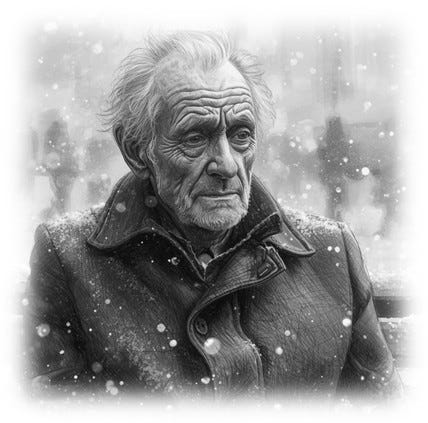 I look at myself in the storefront windows and realize I am older today than I was yesterday. Not that that is a revelation, but instead, I am looking more haggard today than yesterday. Is it because I haven’t eaten today, or because I didn’t eat yesterday? Is it because I don’t feel the cold much as I used to? No, it’s because I am without love. All those who knew me, loved me, lie in the cold earth, just as I walk this cold earth above them. I was a sinful man, with no belief in God, no faith in anything. Perhaps I am not alive, and I am a ghost, destined to wander in this endless, dreary day that does not end. Maybe I was wrong about hell, with heat and flame. For me, it is a cold indifference that I am trapped in, an eternity of fallen ash and bitter tears